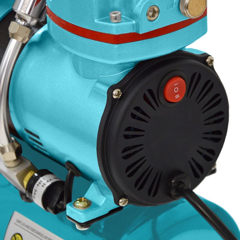 Ausgestattet ist der Airbrush Kompressor mit einem Tragegriff, einer Auto-Stop-Automatik, einem Manometer, einem Wasserabschneider, einem integrierten Durchfluss- und Druckregler und einem Luftdrucktank mit einer Druckluftreserve von 3,5 Litern.