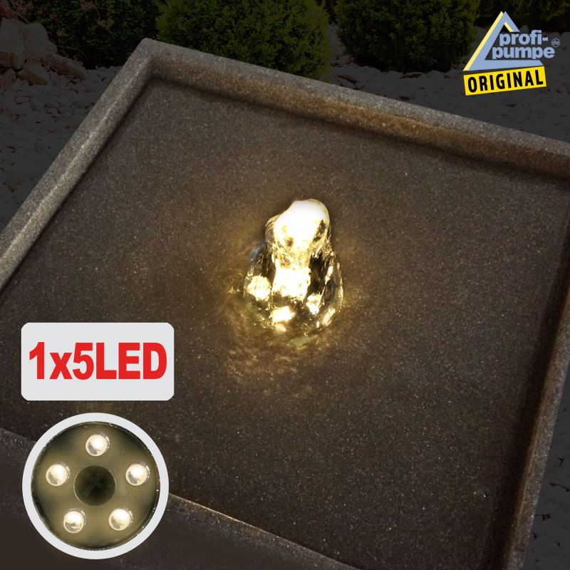 Der Gartenbrunnen ist sowohl bei Tag als auch bei Nacht der perfekte Hingucker. Die mitgelieferte LED-Beleuchtung sorgt für die perfekte Illumination. Die LED-Lichter des austauschbaren LED-Rings erstrahlen in klassischem Weiß.