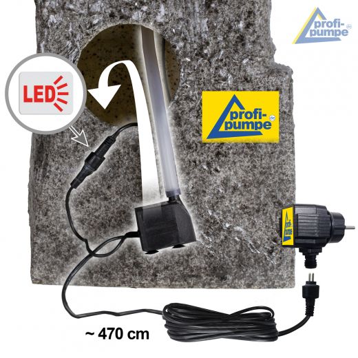 Der Wasserbrunnen ist für den 230-Volt-Betrieb vorgesehen. Die Pumpe und die LEDs werden mit sicherer 12V-Niederspannung betrieben (Adapter im Lieferumfang enthalten). Alle Kabelverbindungen sind verpolungssicher, wasserdicht und absolut funktionssicher. Dank praktischer Steckverbindungen sind alle Komponenten jederzeit austauschbar. So können Sie den Wasserbrunnen mit der effektvollen LED-Beleuchtung und das fließende Wasser jahrelang genießen!