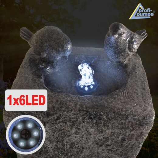Der Garten- und Zimmerbrunnen ist sowohl bei Tag als auch bei Nacht der perfekte Hingucker. Die mitgelieferte LED-Beleuchtung sorgt für die perfekte Illumination. Die LED-Lichter des austauschbaren LED-Rings erstrahlen in einem kalten Weiß.