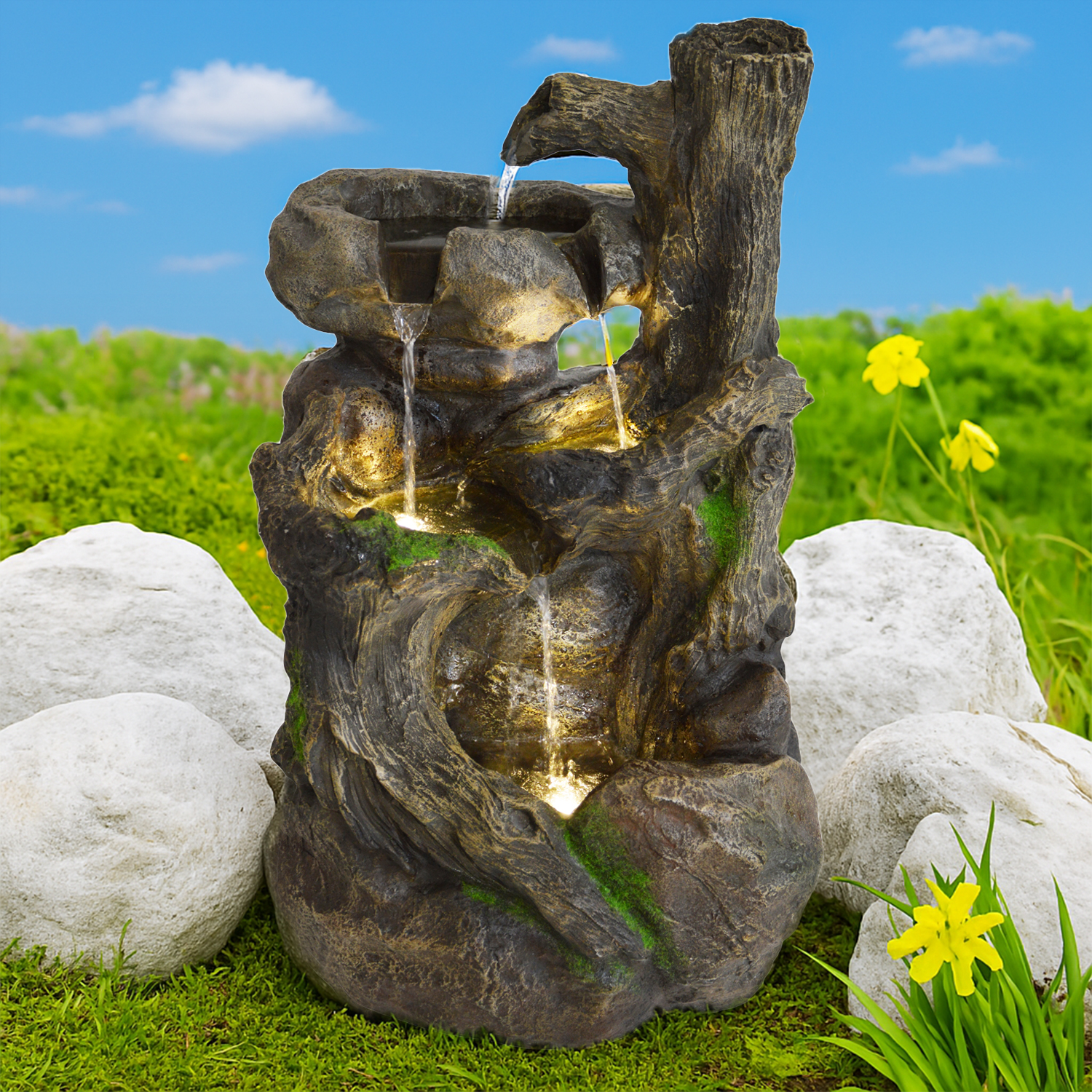 Der Garten- und Zimmerbrunnen "BAUMWURZEL & STEIN-KASKADE" mit der LED-Beleuchtung ist für den Innen- und Außenbereich geeignet. Er sorgt für eine tolle Atmosphäre und Entspannung, wertet jede Umgebung auf und belebt Wohnzimmer, Esszimmer, Flure und Eingangsbereiche, Wintergärten oder Balkone, Terrassen und Gärten im privaten wie gewerblichen Umfeld. Fließendes Wasser wirkt sich positiv auf die Stimmung aus und liefert ein angenehmes Mikroklima an heißen Sommertagen. Die naturgetreue Optik und die warme LED-Beleuchtung machen den Brunnen Tag und Nacht zum perfekten Blickfang.