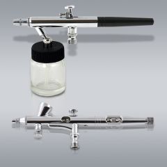Bei einer Double-Action Airbrush werden Luft und Farbmenge mit einem Hebel gesteuert. Durch das Herunterdrücken des Hebels wird die Luftzufuhr reguliert, durch das gleichzeitige Zurückziehen des Hebels wird die Farbmenge variiert. Die maximale Farbmenge kann hinten an der Rändelschraube (Farbmengen-Regulierschraube) eingestellt werden.
